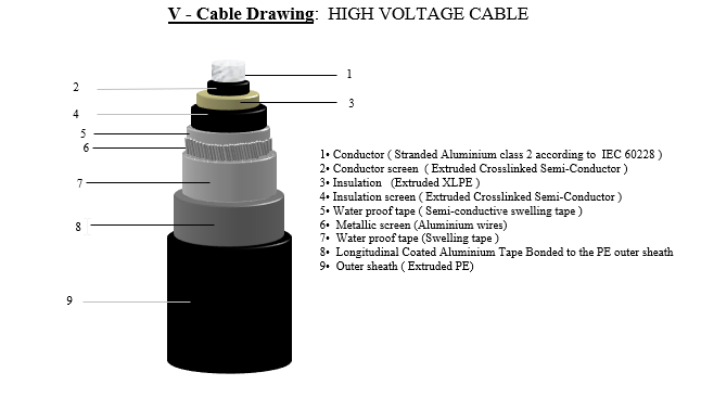 Stranded Aluminum conductor according to IEC 60228, semi conducting conductor screen, insulation of cross-linked polyethylene (XLPE), semi conducting insulation screen, semi conducting swellable tape bedding, aluminum screen, swellable tape bedding, aluminium tape bonded to PE sheath.